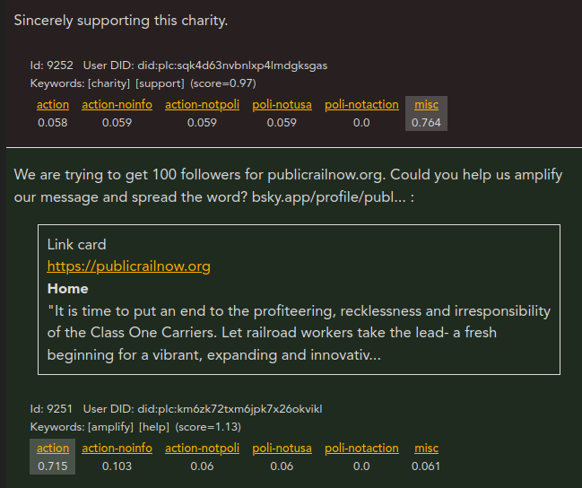 Sometimes you'll see a post whose highest confidence tag is action but it's marked red and thus not in the feed. What this means is that that classification didn't pass the minimum confidence threshold, which is currently set at 0.7. In these situations, if the post has clear "yeah this is very obviously an action post" vibes, you can explicitly put it in the learning queue as action to ensure it goes into the feed and to feed it into the learning. But if it's definitey action but the wording feels a little tenative or otherwise doesn't fully knock it out of the park, it's best to just leave the confidence as-is.